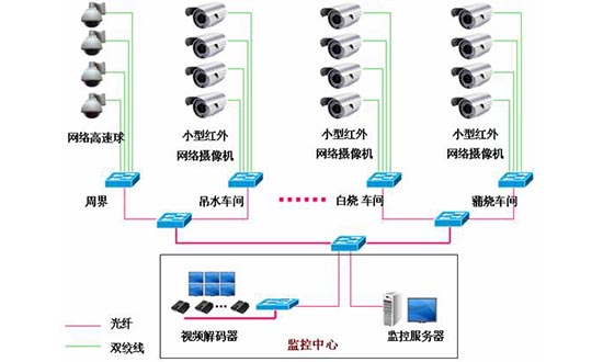 該方案中攝像機(jī)到交換機(jī)采用超五類無屏蔽雙絞線傳輸視頻信號,采用雙芯雙絞線傳輸探測器聯(lián)動信號,各個車間交換機(jī)到監(jiān)控室采用光纖傳輸。